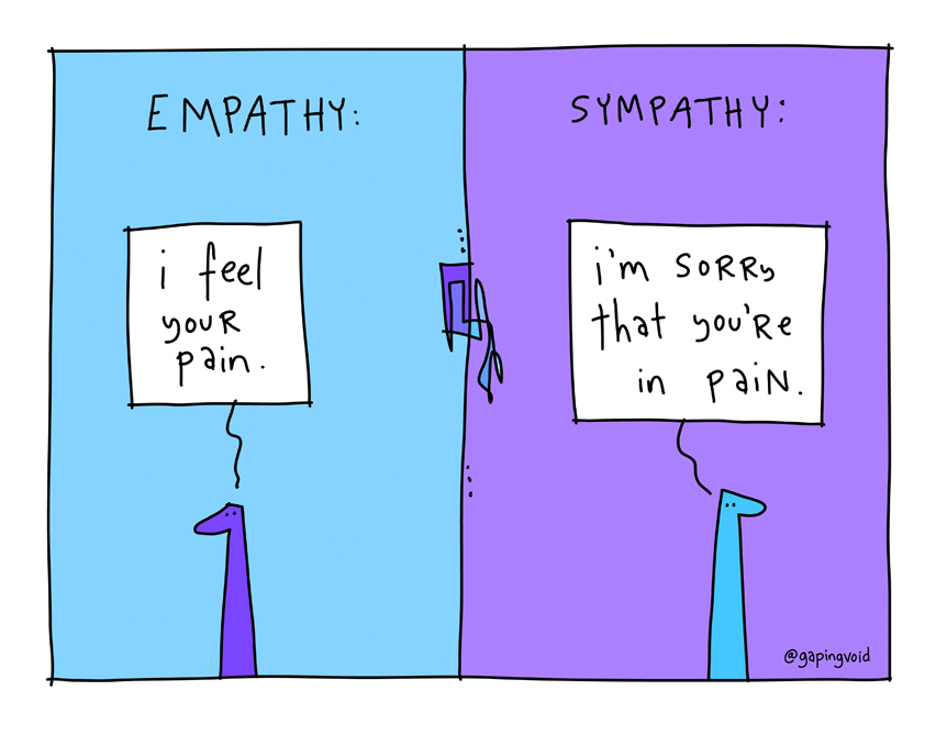 Postoji razlika između empatije i saosećanja, iako se često misli kako su ove reči sinonimi. Ako je empatija sposobnost da se povežemo sa osobom na nivou i situacije i emocija, saosećanje se svodi na nivo prepoznavanja emocija. Postoje mnogi životni događaji u kojima ćemo se saosećati sa drugim ljudima, ali ne i empatisati. Biće nam žao što je neko tužan zbog određene situacije, ali nećemo razumeti suštinski tu tugu u toj situaciji. I to je uredu. Ne možemo da osećamo empatiju prema svima i u svakoj situaciji.